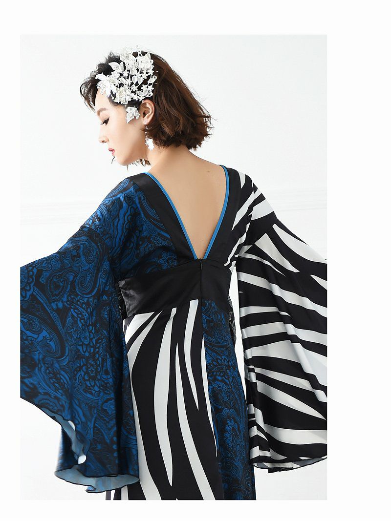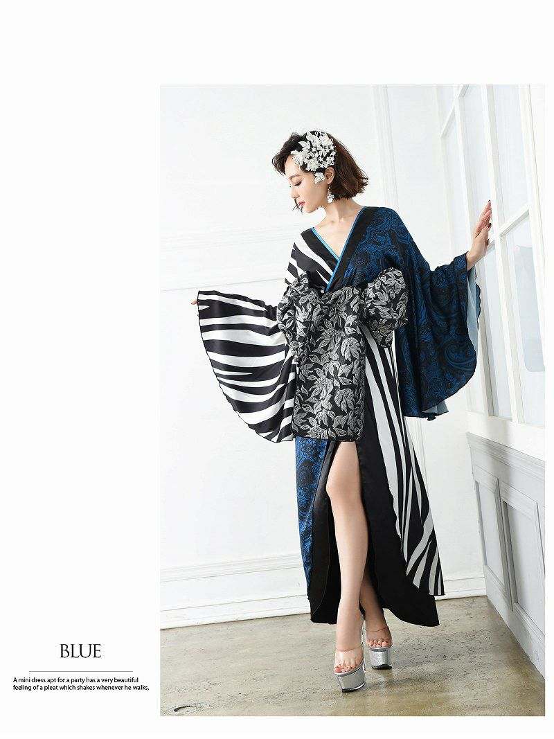和洋MIXのゼブラ柄×ペイズリー柄の半身柄がオシャレな着物ドレスは谷間魅せも出来る妖艶な雰囲気の和風ドレス。